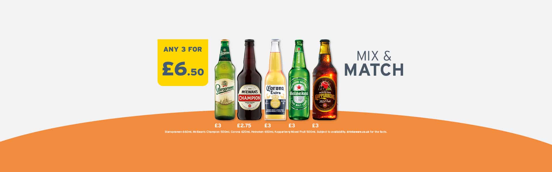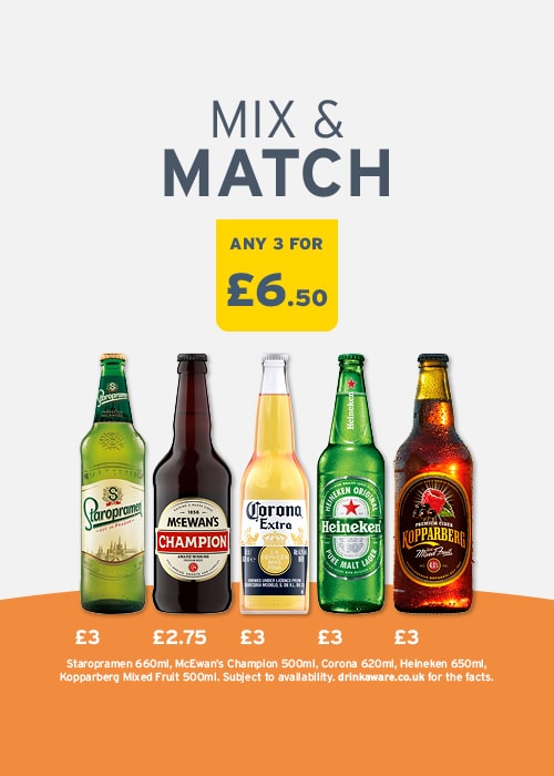 Pick up 3 for £6.50 on a selection of your favourite beers, ciders and cocktails