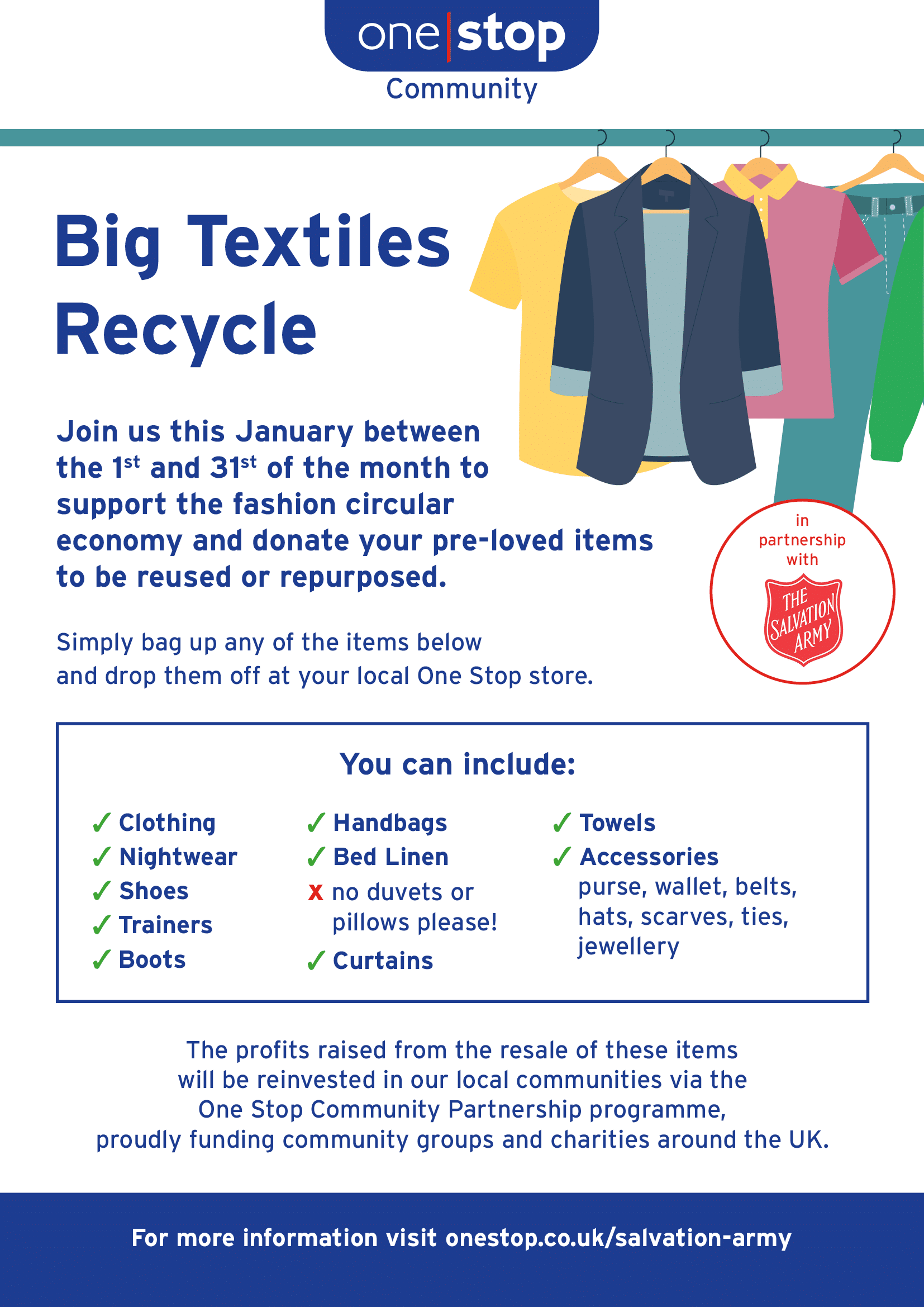 We are proud to have been working with Salvation Army clothing banks at over 200 of our stores to recycle clothing and textiles.